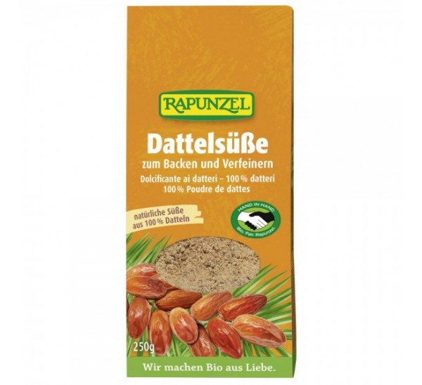 Îndulcitor natural fabricat din curmale 100% ecologice măcinate! Îndulcitorul de curmale oferă mâncărurilor tale dulci ceva special și aduce aroma proaspătă în bucătăria ta. Datorită aromei sale subtile, îndulcitorul de curmale poate fi folosit într-o varietate de moduri în produse de patiserie și mâncăruri sărate. Curmalele sunt produse conform criteriilor de comerț echitabil și provin de la parteneri Rapunzel HAND IN HAND din Tunisia.
